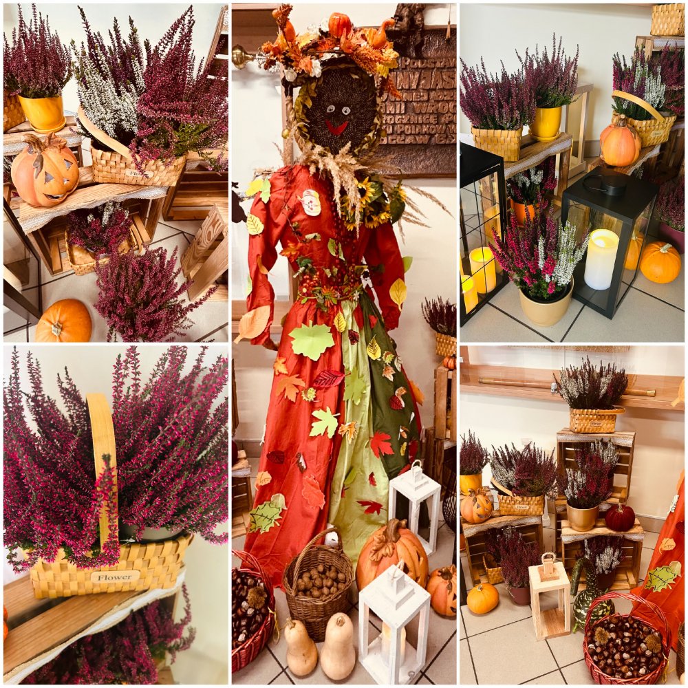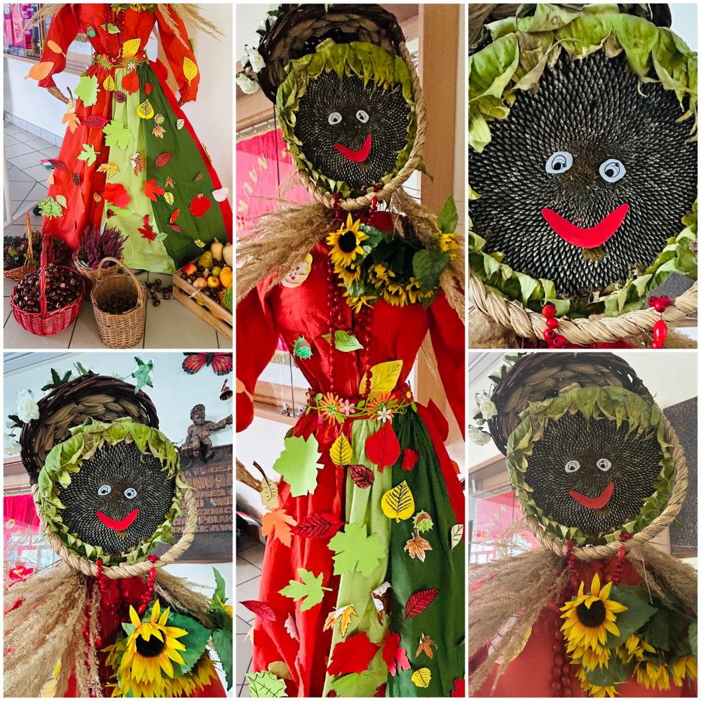 Stoi w holu i wita wszystkich wchodzących do naszej szkoły. Ma piękną suknię w jesiennych kolorach, ozdobioną liśćmi zrobionymi przez dzieci. Na głowie kapelusz z wikliny, przyozdobiony kwiatami. Twarz ma z dorodnego słonecznika, na szyi korale z jarzębiny, a wokół kosze pełne darów jesieni – kasztanów, żołędzi, liści i orzechów.