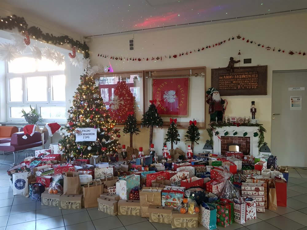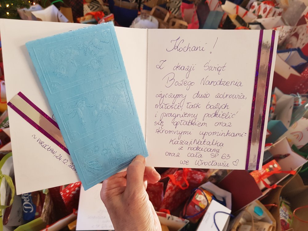 Pragnę gorąco podziękować wszystkim, za udział w akcji „Chcemy sprawić im radość”. Dzięki Wam udało się przygotować ponad 150 świątecznych paczek dla mieszkańców Domu Pomocy Społecznej we Wrocławiu przy ul. Rędzińskiej. Paczki i kartki zostały przekazane do ośrodka. Mieszkańcy Domu Pomocy Społecznej dostaną je podczas wigilii. To była wspaniała lekcja wrażliwości, empatii i otwarcia na drugiego człowieka. Dzięki Państwu na twarzach podopiecznych DPS pojawił się uśmiech i poczucie, że nie są sami. Dziękuję za zaangażowanie, hojność i dobre serce. Razem udało się Nam sprawić wiele radości osobom potrzebującym. To wspaniałe, że wspólnie możemy uczyć dzieci wrażliwości, dzielenia się i troski o drugiego człowieka. Uczniom i wolontariuszom dziękuję za piękne, własnoręcznie zrobione kartki świąteczne i pomoc przy pakowaniu paczek. To była wspaniała lekcja wrażliwości, empatii i otwarcia na drugiego człowieka.