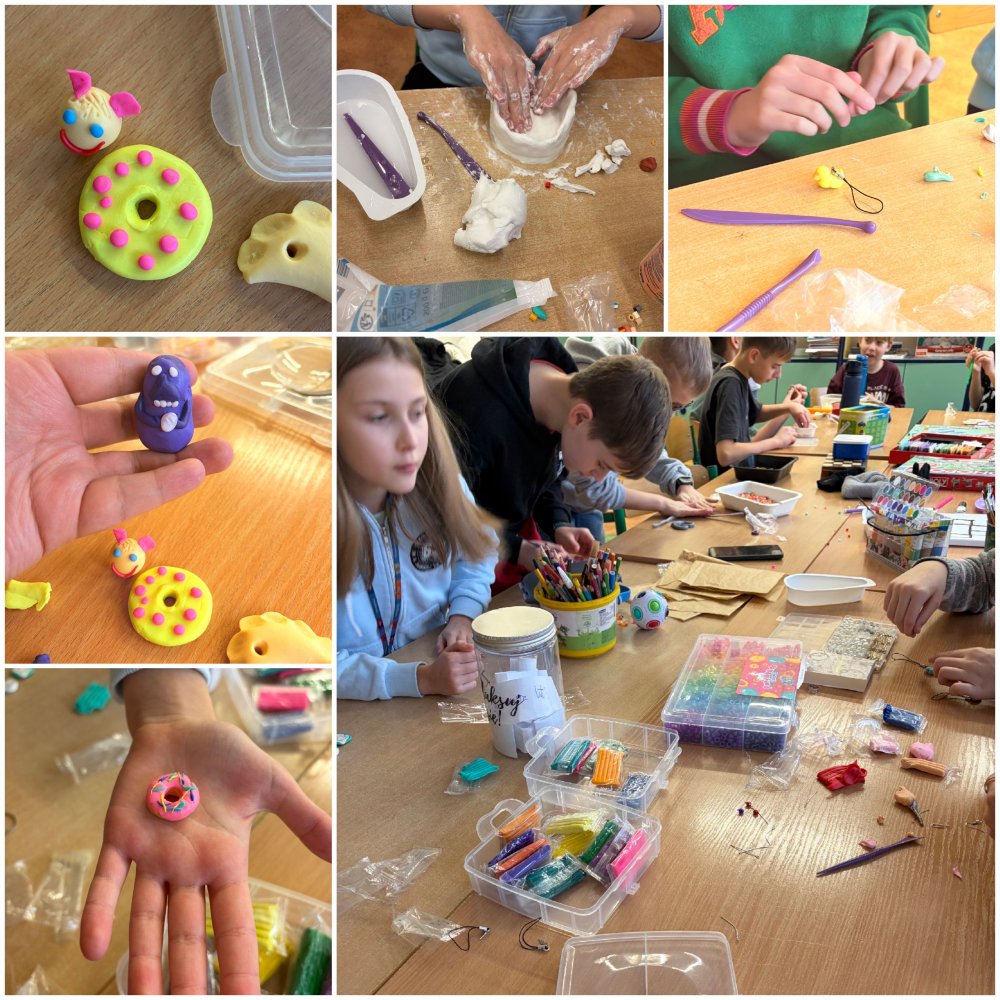 Na miejscu w szkole także działo się bardzo dużo. Dzieci brały udział w zadaniach kreatywnych, takich jak lepienie w glinie samoutwardzalnej oraz tworzenie biżuterii z gliny polimerowej. Powstały wyjątkowe prace, które każdy mógł zabrać ze sobą na pamiątkę.