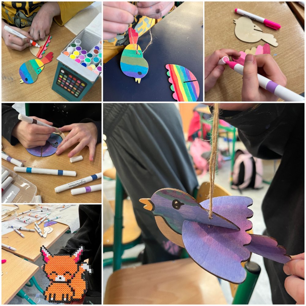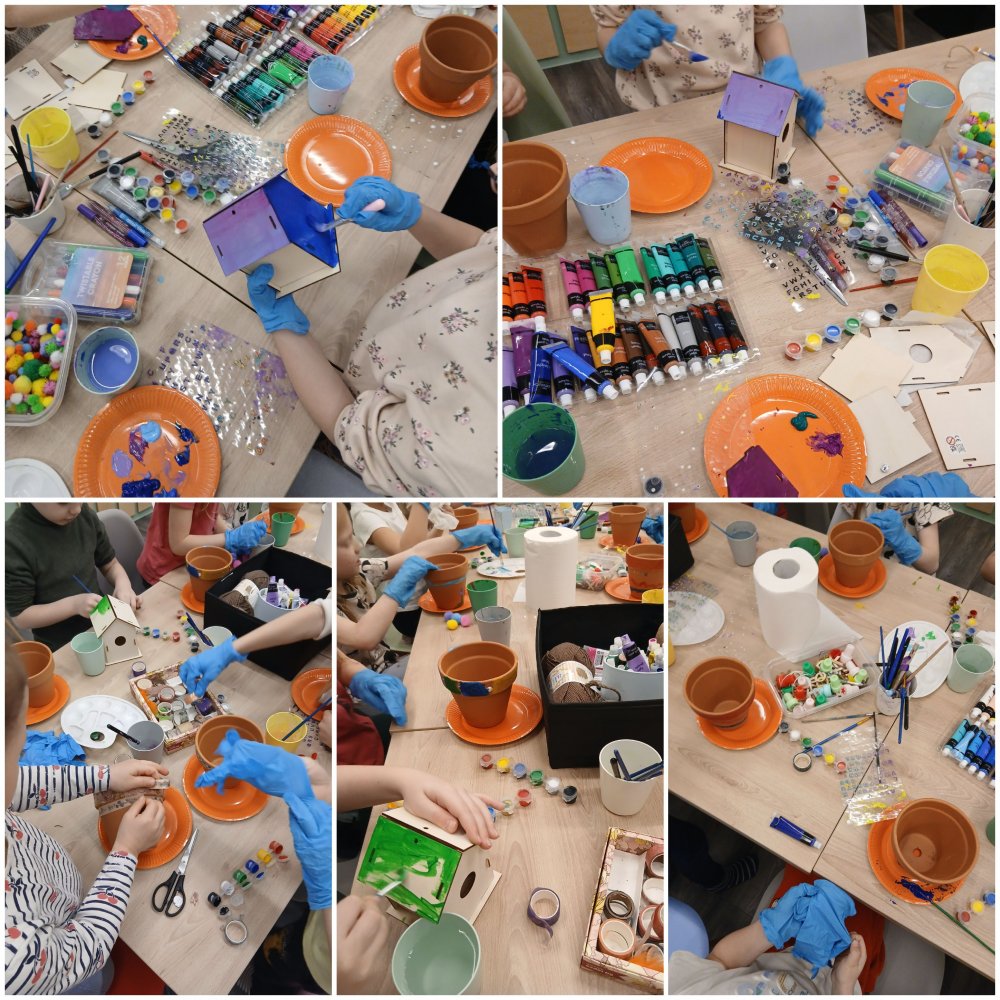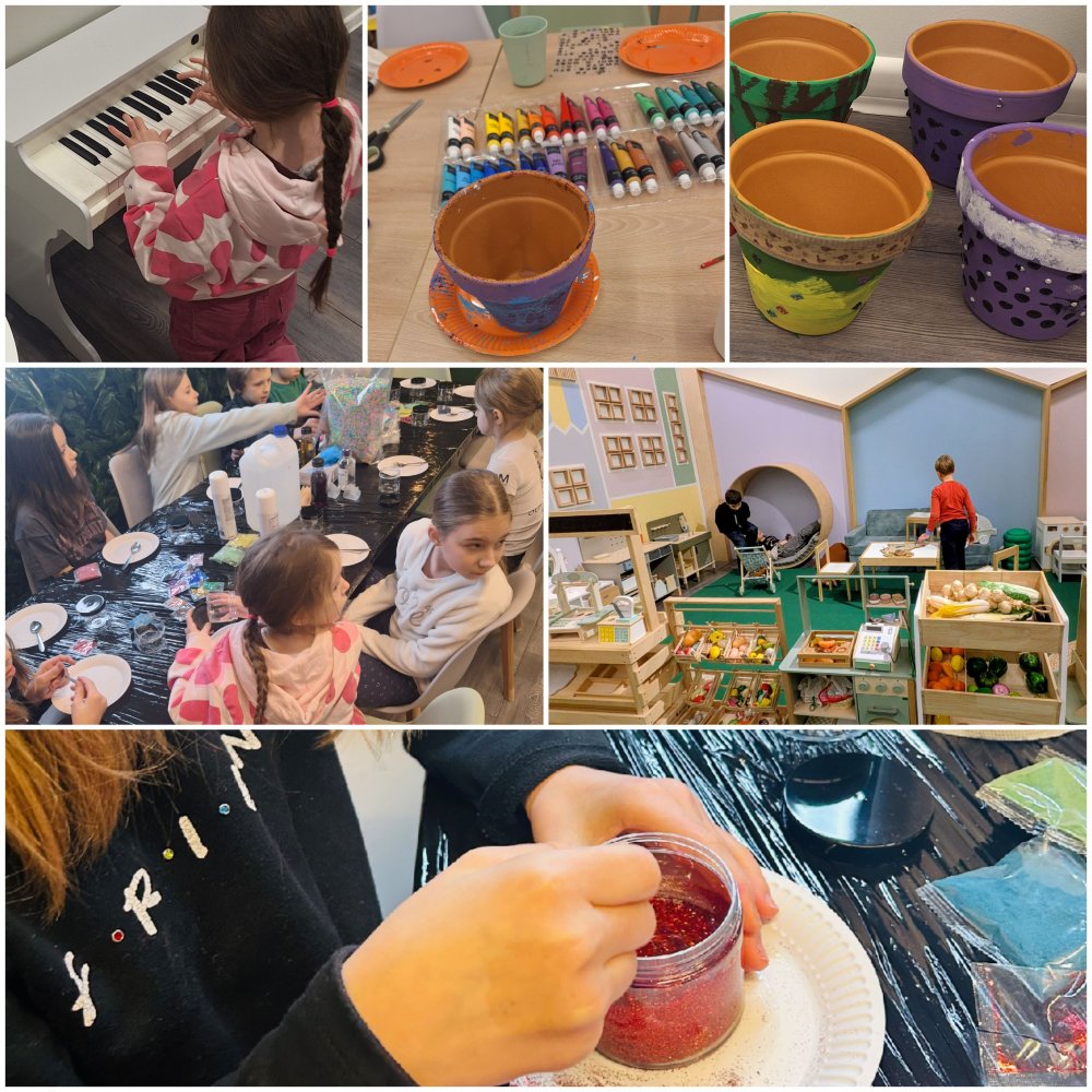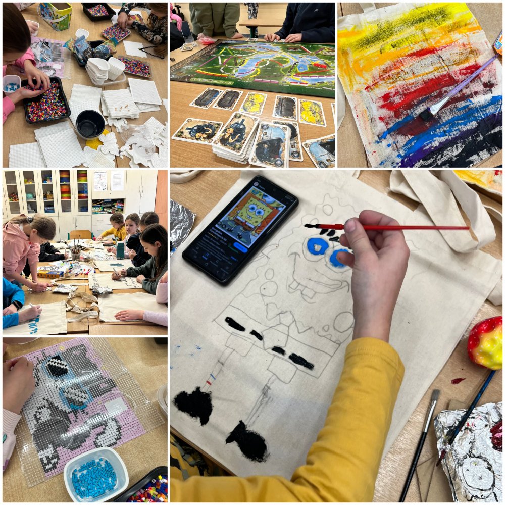 Również w szkole nie brakowało atrakcji. Dzieci malowały torby, tworzyły breloki z gliny, a wolny czas spędzały na grach w piłkarzyki oraz planszówki, ucząc się zdrowej rywalizacji i współpracy w grupie.