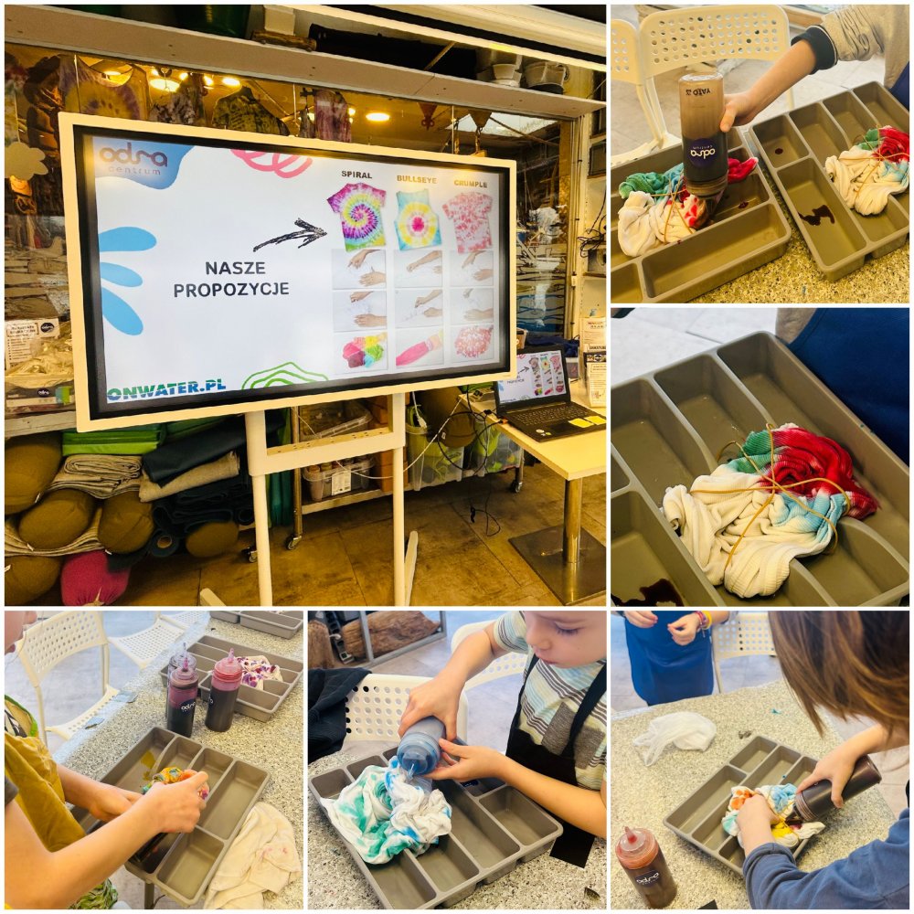 Kolejnym punktem programu była wizyta w Odra Centrum, gdzie dzieci brały udział w ciekawych warsztatach barwienia tkanin. Zajęcia pozwoliły poznać nowe techniki artystyczne i rozwinąć kreatywność.