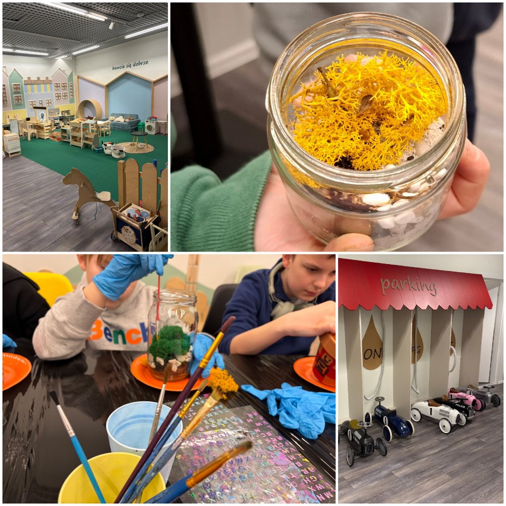 W programie znalazła się wycieczka autokarowa do Alei Bielany, gdzie dzieci odwiedziły Lindenpark. Na miejscu czekało mnóstwo atrakcji: zabawy klockami na dużej sali, warsztaty sterowania dronem, emocjonujący symulator samochodowy, a także zajęcia plastyczne i manualne. Uczestnicy tworzyli własne slimy DIY, malowali koszulki oraz doniczki, a także przygotowywali niezwykłe lasy w słoiku, które stały się piękną pamiątką tego dnia.