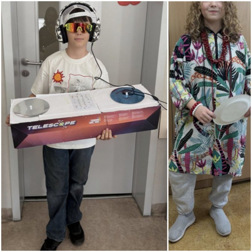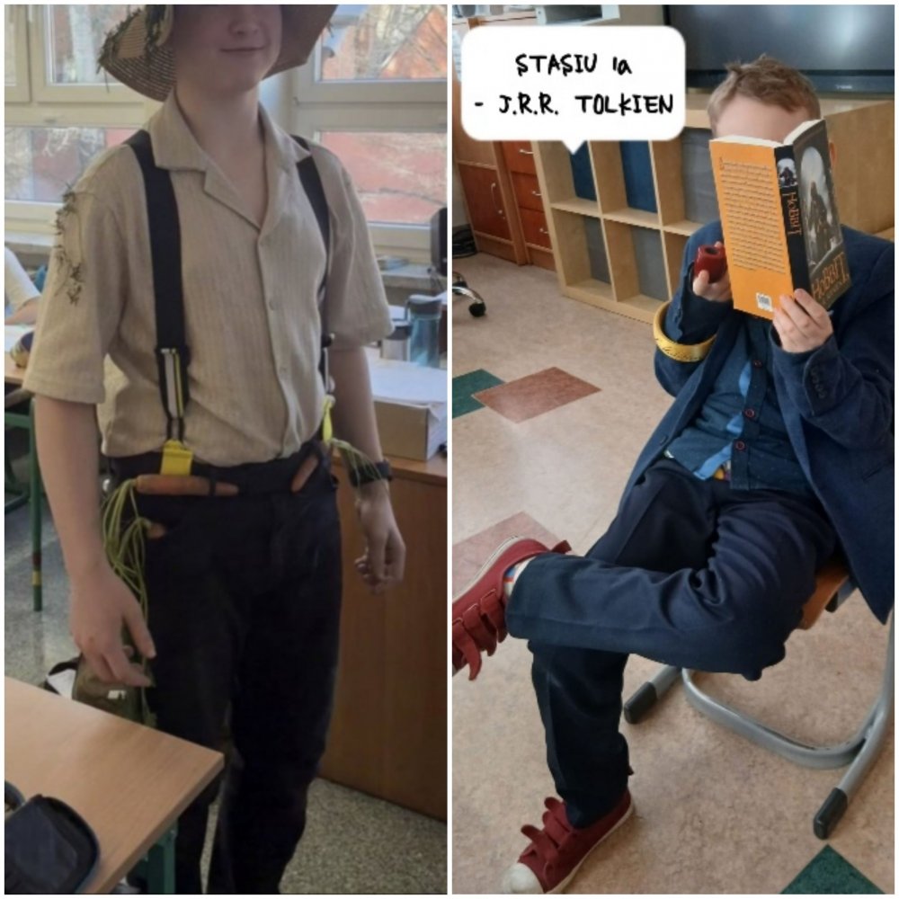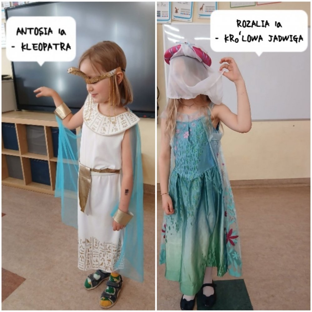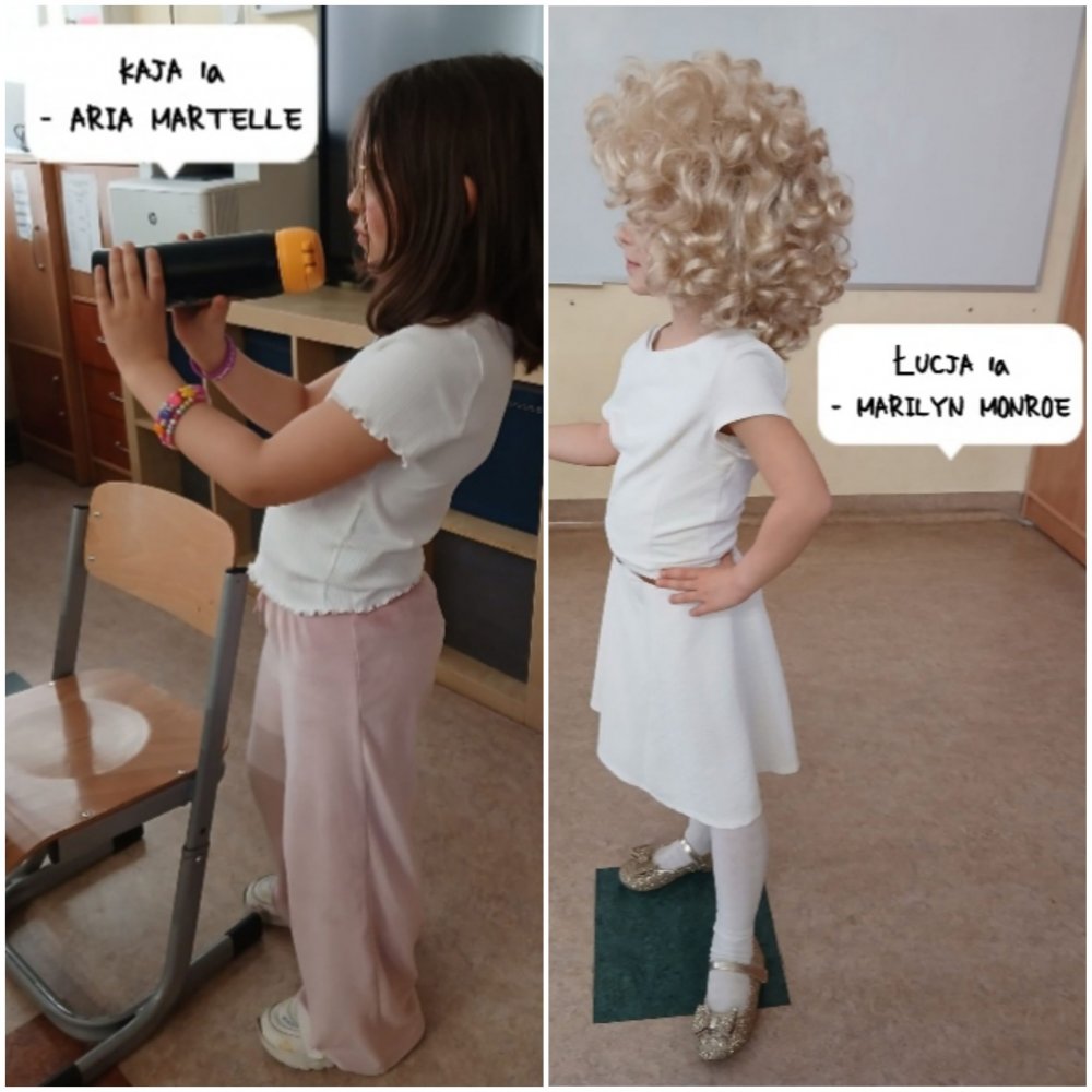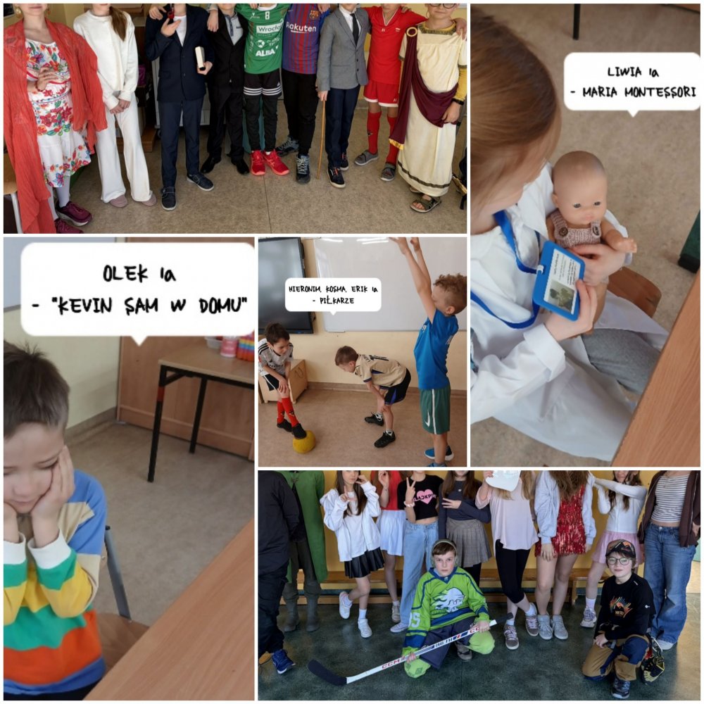 Do działań klas starszych włączyły się także kl. 1-3. Klasa 1a również przyłączyła się do akcji. Uczestnicy: Stanisław - przebranie J.R.R Tolkien. Jest to jeden z ulubionych pisarzy ucznia, na podstawie jego książki, powstał piękny film. Liwia wybrała postać Marii Montessori - postać niezwykle ciekawa, podróżniczka, lekarka. Olek P. - został przebrany za bohatera Kevin sam w domu. Olkowi podoba się, że chłopiec w filmie jest bystry, pomysłowy i sprytny. Łucja - przebranie Marilyn Monroe, uczennica zafascynowana śpiewem i tańcem aktorki. Kosma, Hieronim, Erik przebrali się za słynnych, wielkich piłkarzy, np. Vini, Lamine Yamal. Chłopcy kierowali się przy wyborze swoją pasją do gry w piłkę. Antonina przebrana za Kleopatrę. Dla uczennicy Kleopatra była boska, piękna, ceniona i to przykuło uwagę Antosi. Rozalia wybrała Królową Jadwigę, która była pomocna, potężna, była Wielką Filantropką. Kaja wybrała postać piosenkarki Aria Martelle, która potrafi śpiewać, tańczyć, jest bardzo popularna w Polsce. Uczniowie z zapartym tchem opowiadali o swoich postaciach, prezentowali części garderoby. Był to dzień pełen wrażeń dla całej klasy. (tę część notatki z kl. 1a przygotowała: Malwina Kąkalec).