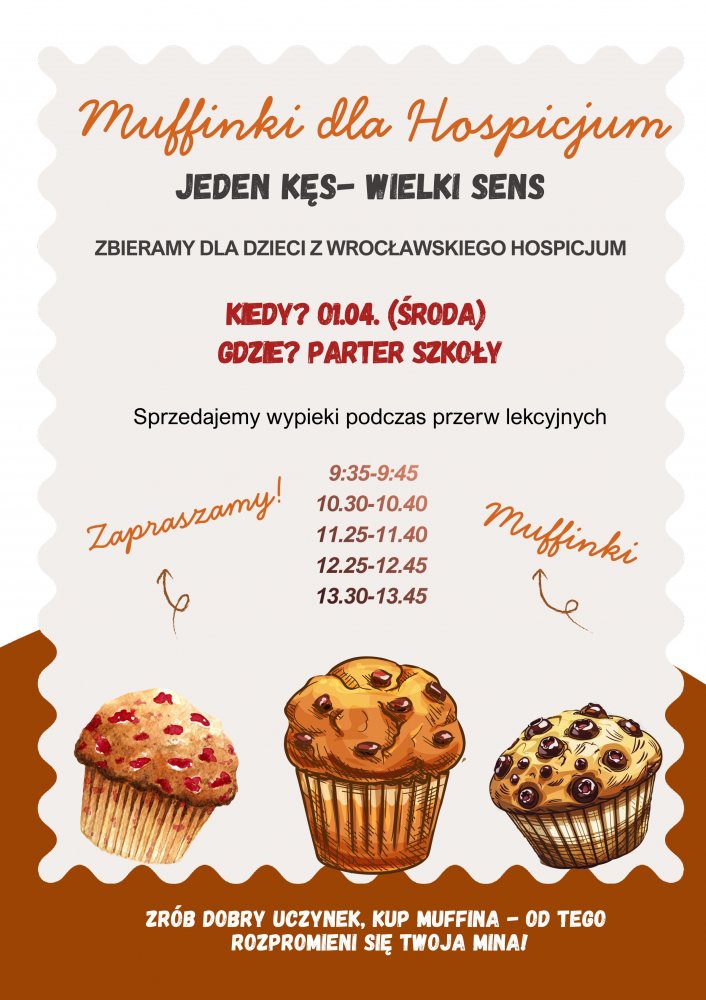 Serdecznie zapraszamy całą społeczność szkolną do wsparcia akcji charytatywnej, która odbędzie się już w najbliższą środę - 1 kwietnia. Tego dnia nasi szkolni wolontariusze, ubrani w wesołe, barwne stroje, będą sprzedawać domowe muffinki. Dochód z akcji przeznaczymy na wsparcie Hospicjum Dla Dzieci we Wrocławiu. Chcemy, aby był to dzień pełen radości, kolorów i wspólnego pomagania. Zachęcamy wszystkich do włączenia się w inicjatywę i wsparcia zbiórki. W czasie zbliżających się Świąt pamiętajmy o tych, którzy szczególnie potrzebują naszej troski i serca.