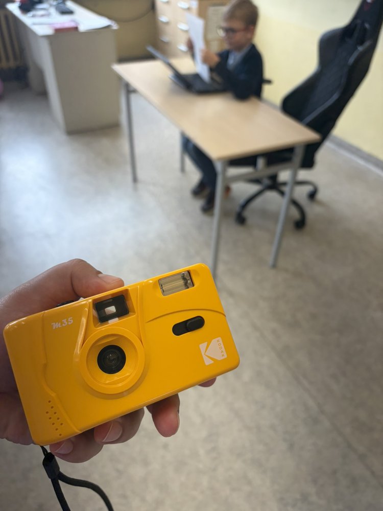 Lekcja była również okazją do niezwykłego doświadczenia – klasowej sesji zdjęciowej… aparatem analogowym. Dla wielu uczniów był to pierwszy kontakt z tego typu sprzętem. W czasach natychmiastowych zdjęć w telefonie możliwość wykonania fotografii „na kliszy” okazała się czymś zupełnie nowym i intrygującym.