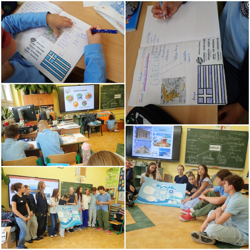 Na początku uczniowie klasy 8b zaprezentowali przygotowany przez siebie plakat oraz podzielili się z młodszymi kolegami ciekawostkami na temat Grecji. Następnie obejrzeliśmy multimedialną prezentację, dzięki której poznaliśmy najważniejsze greckie zabytki, elementy kultury i kuchni, a także nauczyliśmy się kilku podstawowych słów w języku greckim.