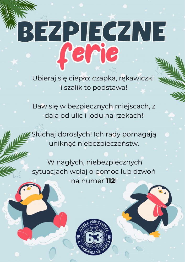 Jak co roku, Szkoła Podstawowa nr 63 przygotowała mnóstwo atrakcji w pierwszym tygodniu ferii zimowych dla województwa dolnośląskiego, w terminie 02-06.02.2026r. dla uczniów z klas 1-6. W sprawie rekrutacji uzupełniającej na wolne miejsca prosimy o kontakt z sekretariatem szkoły! Na uczestników półkolonii czekamy od godz. 7:00, opiekę sprawujemy do godz. 17:00. Wypoczywamy pod hasłem "Zimo, baw się razem z nami". Program grup jest zróżnicowany.