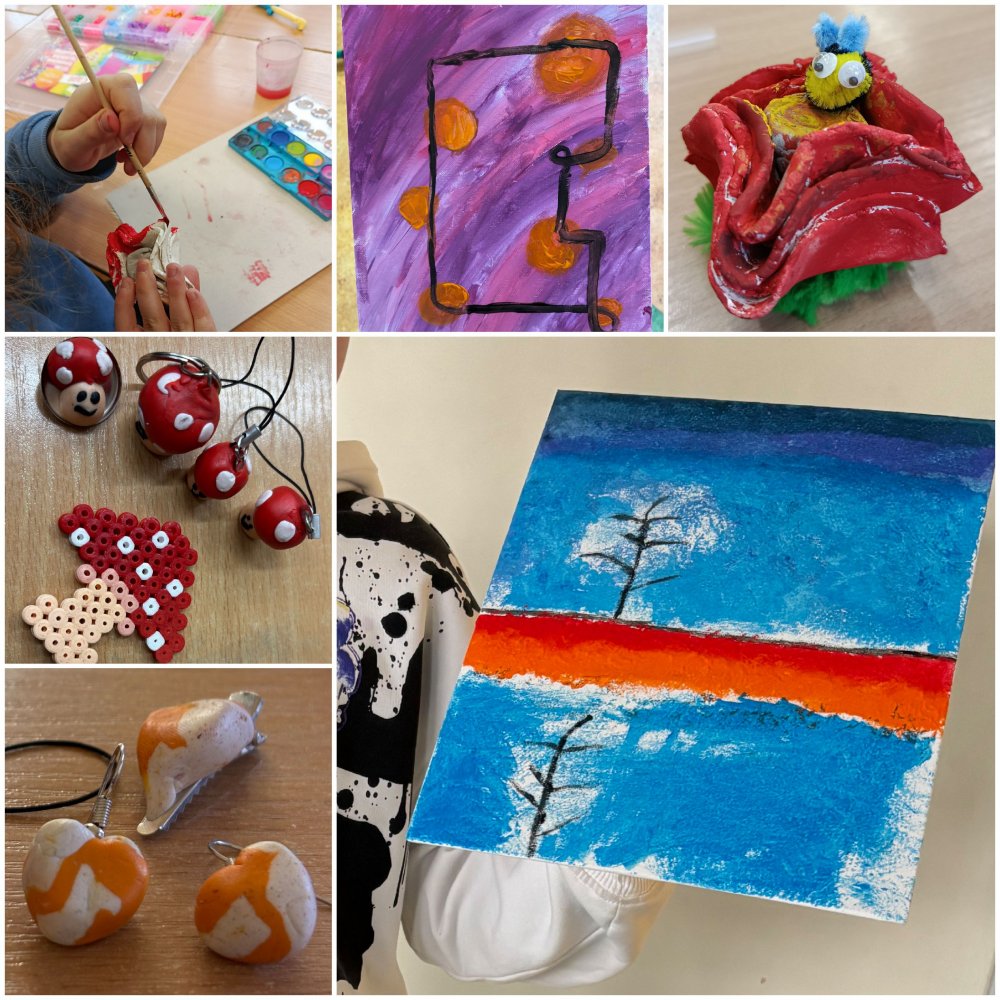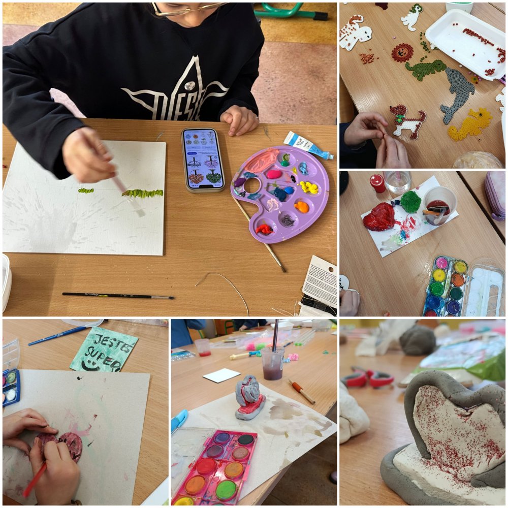 Po powrocie z wyjść nie zwalnialiśmy tempa – malowaliśmy oryginalne grafiki na płótnie, projektowaliśmy walentynkowe breloczki, lepiliśmy z gliny i realizowaliśmy kolejne twórcze pomysły. Każda aktywność dawała dzieciom przestrzeń do wyrażania siebie, współpracy i dobrej zabawy. To był dzień pełen uśmiechów, nowych doświadczeń i pozytywnej energii, który na długo zostanie w naszej pamięci!