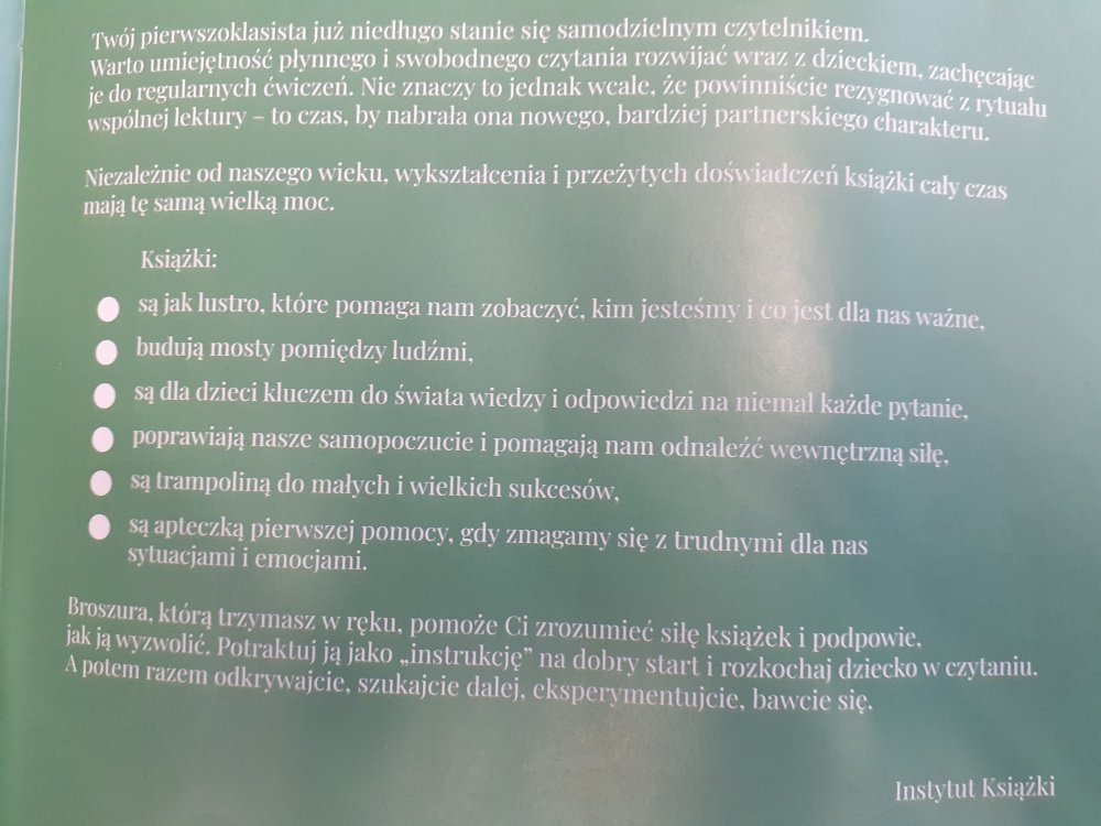 W ramach projektu rodzice pierwszaków otrzymują broszurkę, jak wspierać dzieci w nauce czytania, a dzieci w prezencie otrzymują książkę Justyny Bednarek „Wnuczka antykwariusza”.