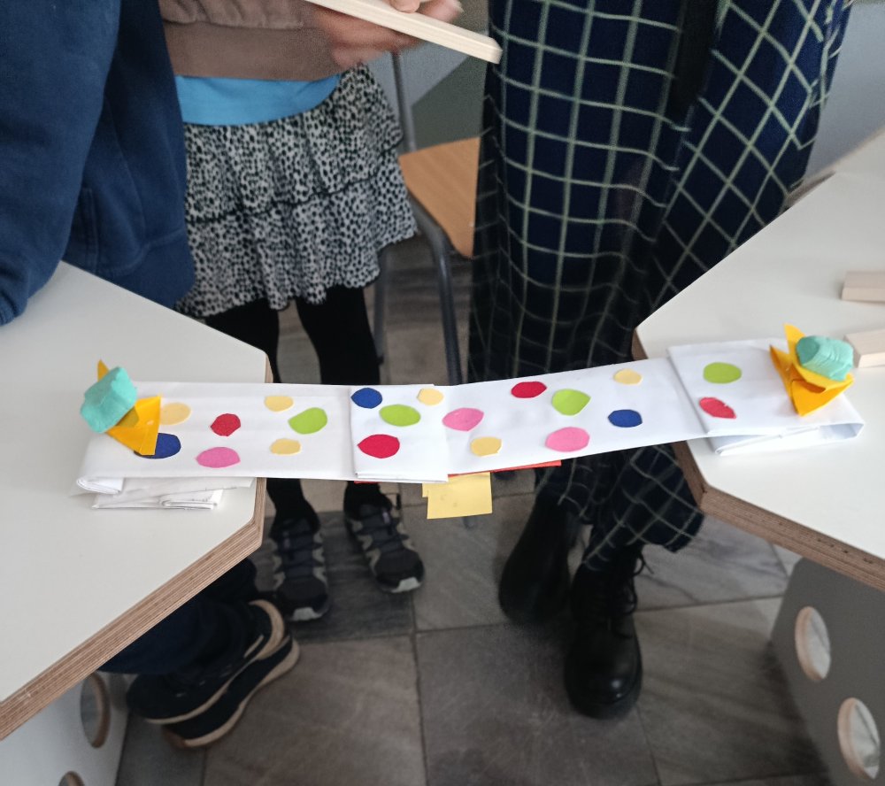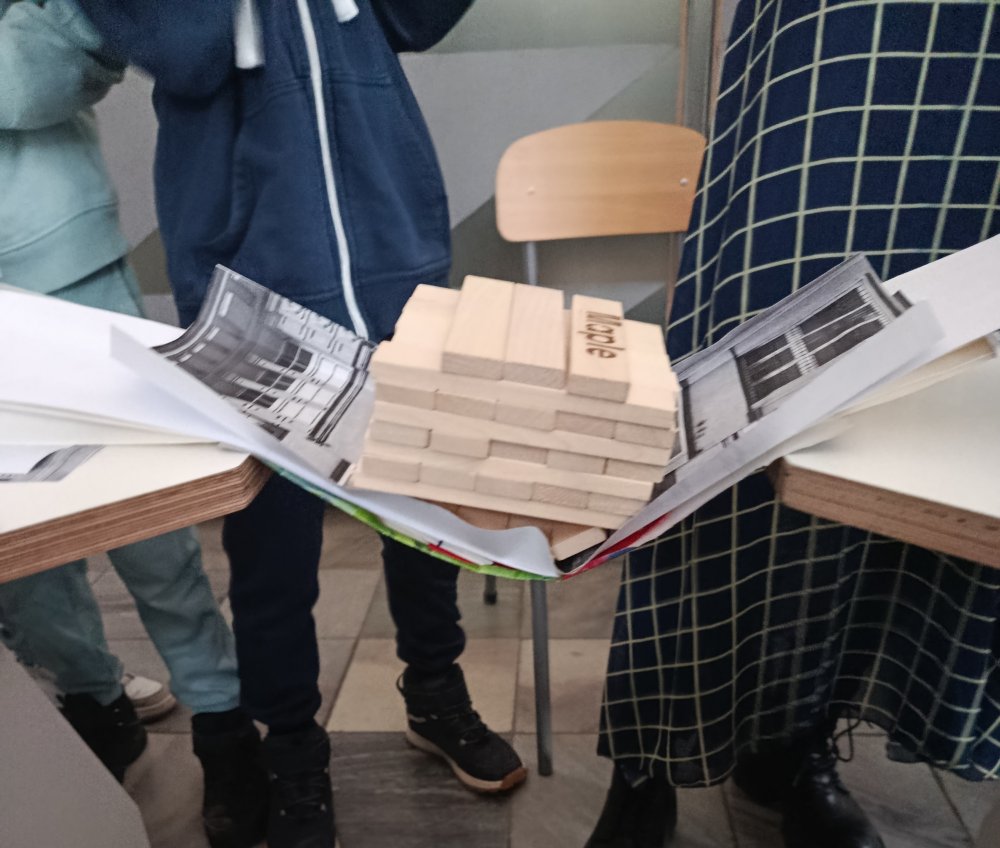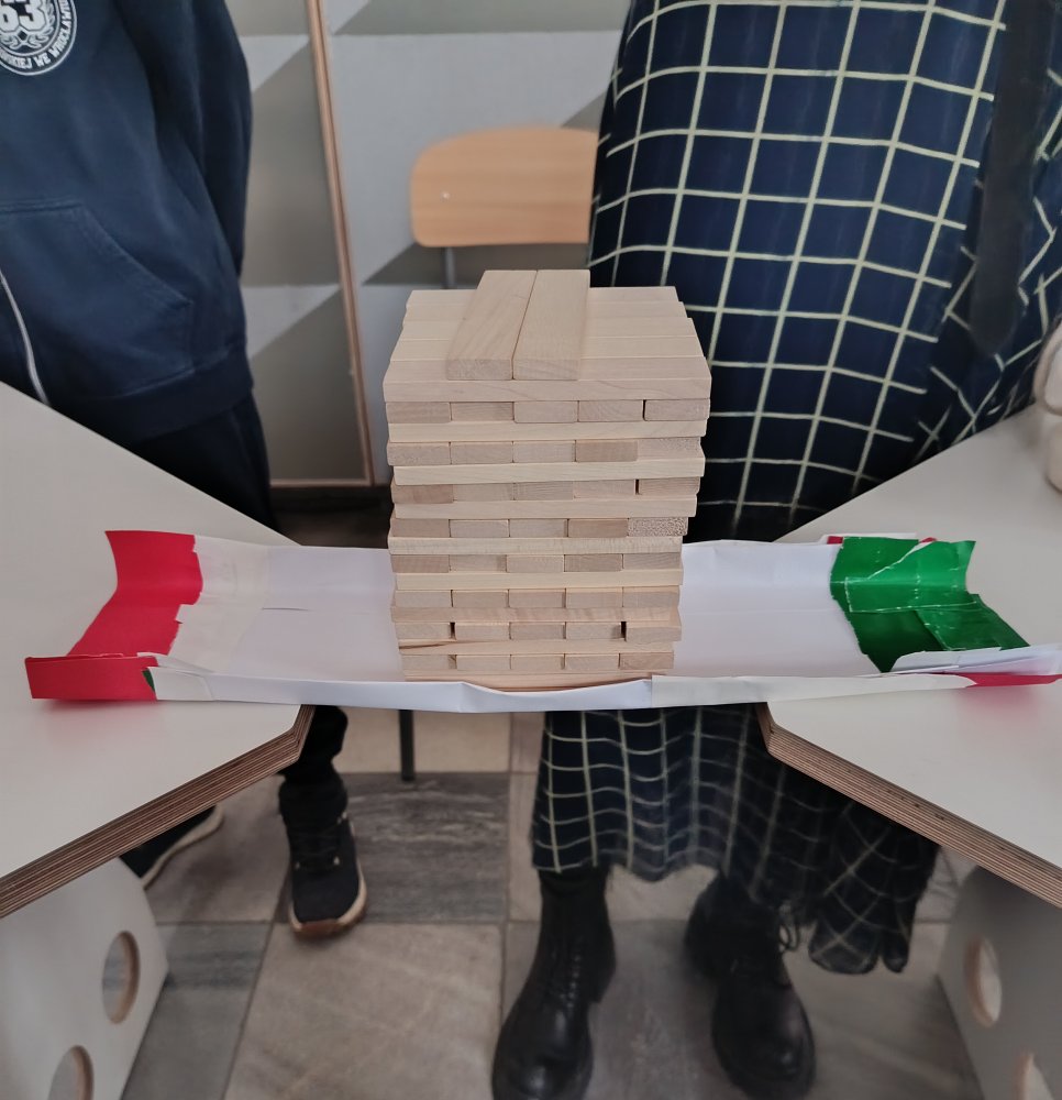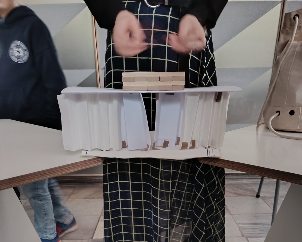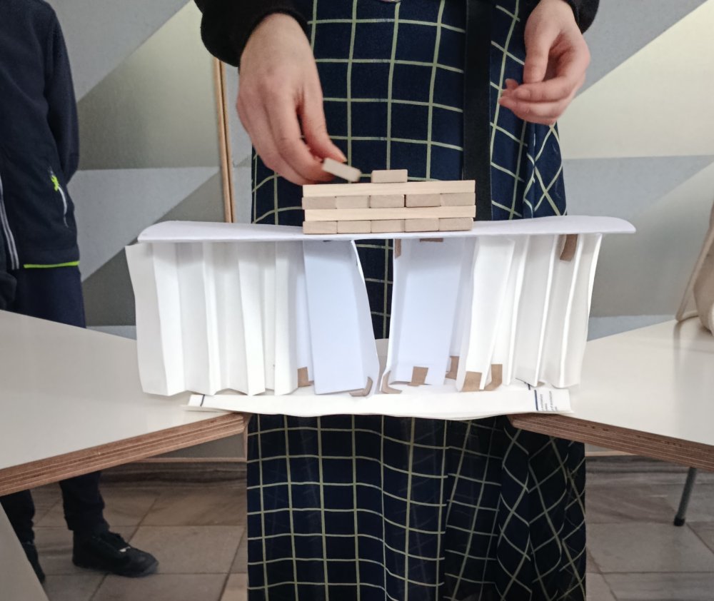 Największe emocje wzbudziła część praktyczna zajęć. Uczniowie pracowali w grupach i wykonywali różne zadania konstrukcyjne, które wymagały współpracy, kreatywności oraz logicznego myślenia. Finałem warsztatów było wyzwanie polegające na zbudowaniu z papieru mostu, który utrzyma jak największy ciężar.