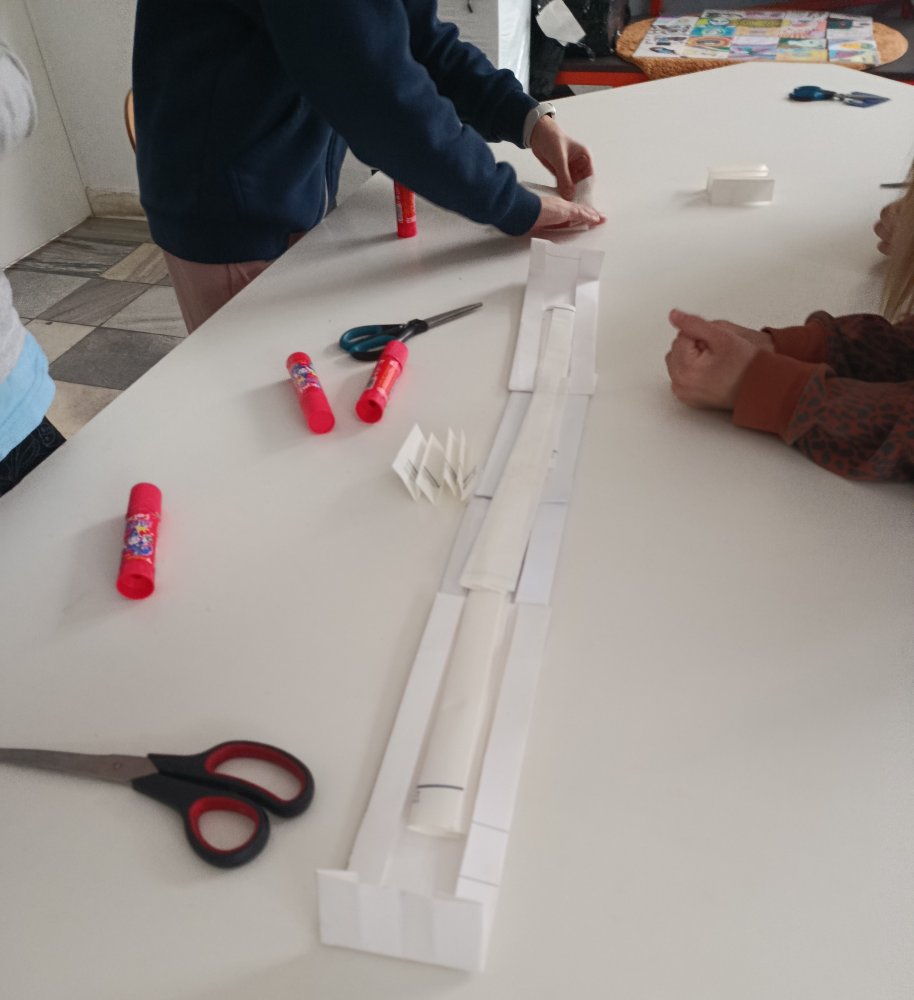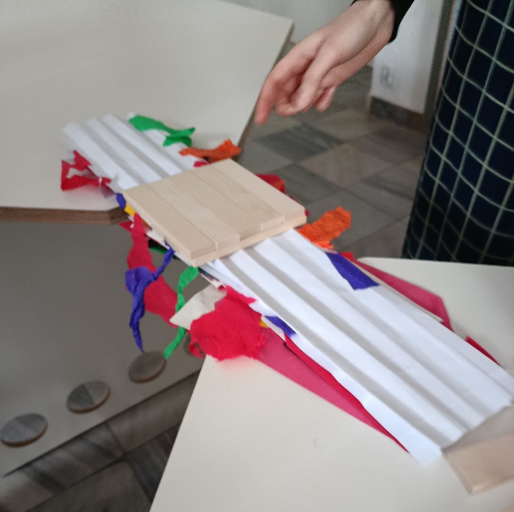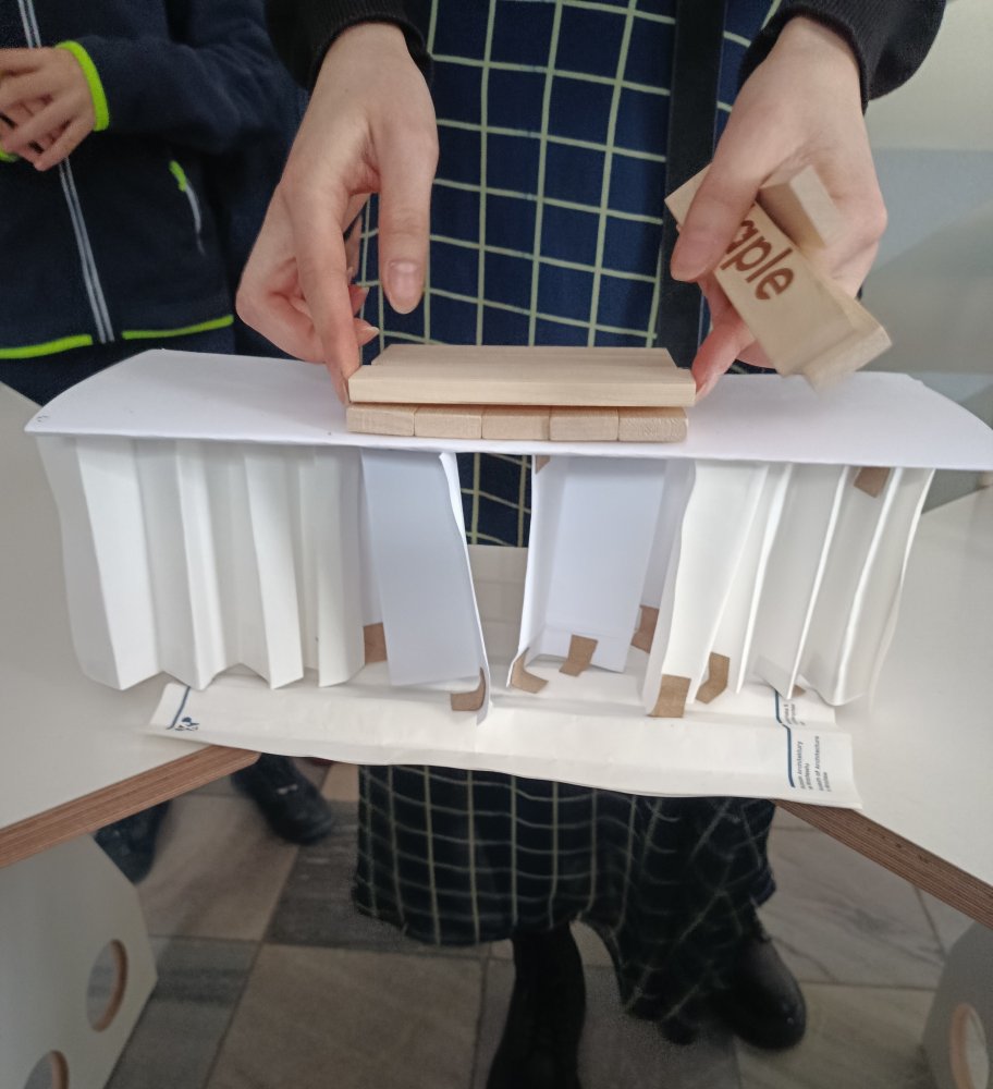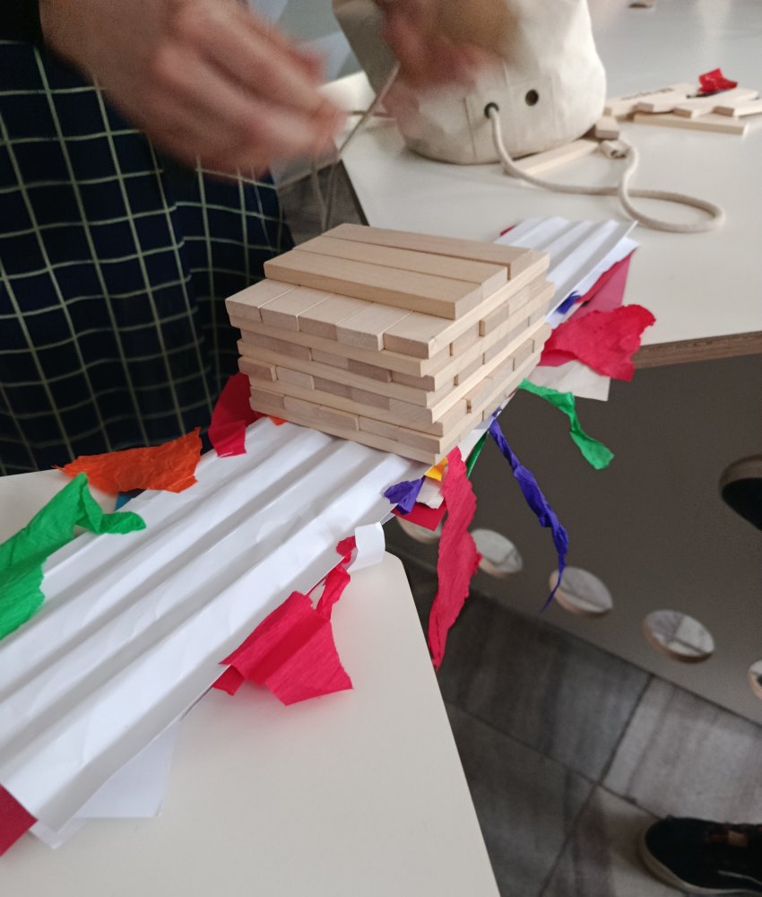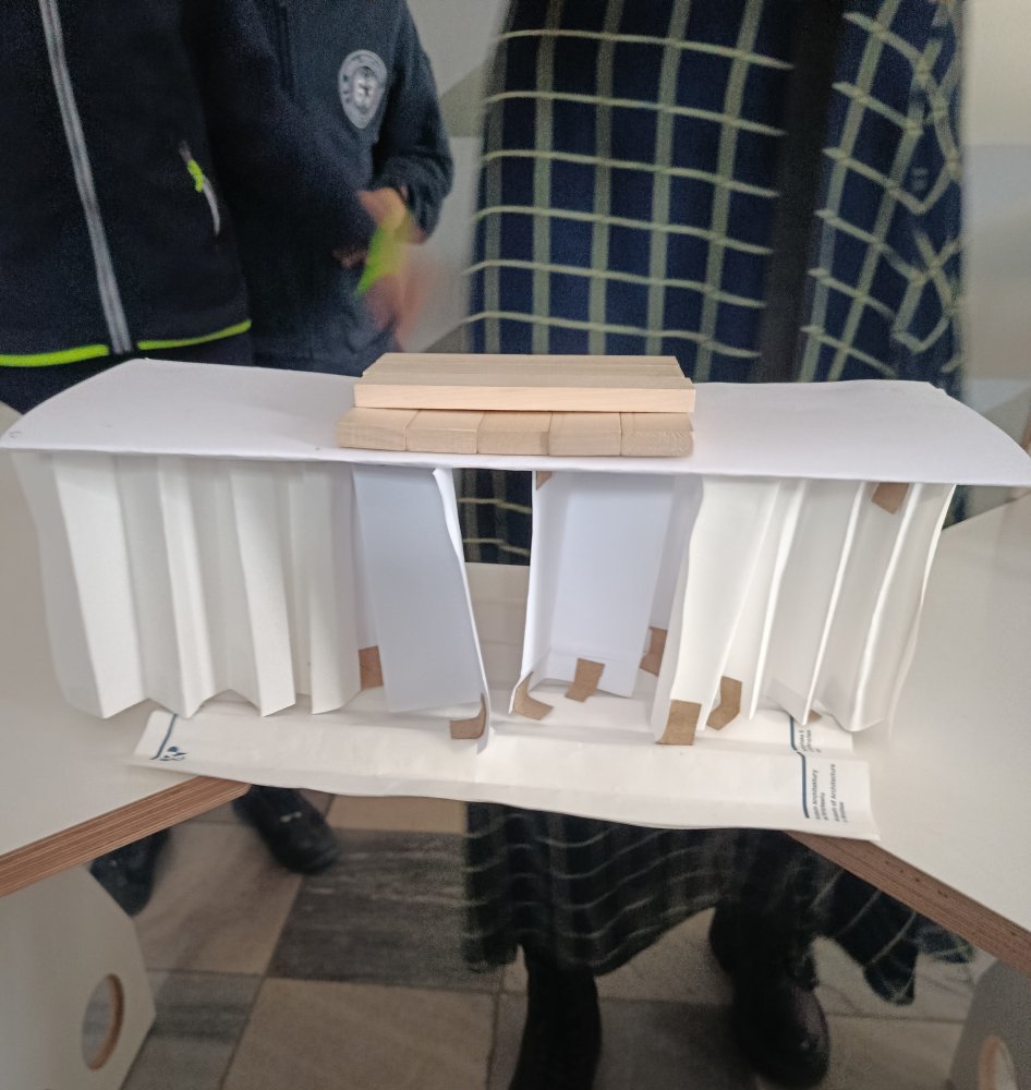 Największe emocje wzbudziła część praktyczna zajęć. Uczniowie pracowali w grupach i wykonywali różne zadania konstrukcyjne, które wymagały współpracy, kreatywności oraz logicznego myślenia. Finałem warsztatów było wyzwanie polegające na zbudowaniu z papieru mostu, który utrzyma jak największy ciężar.
