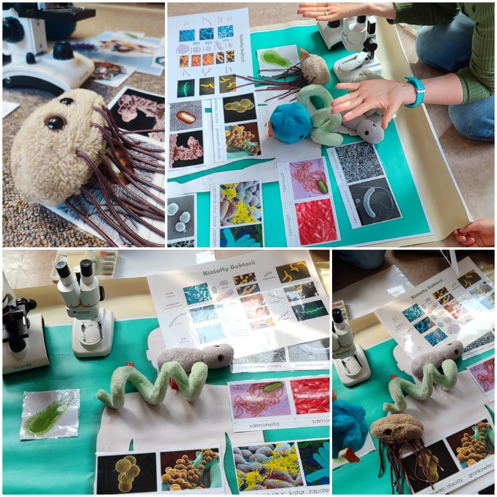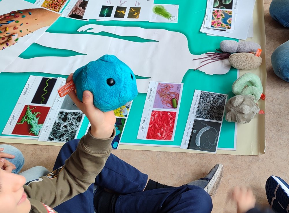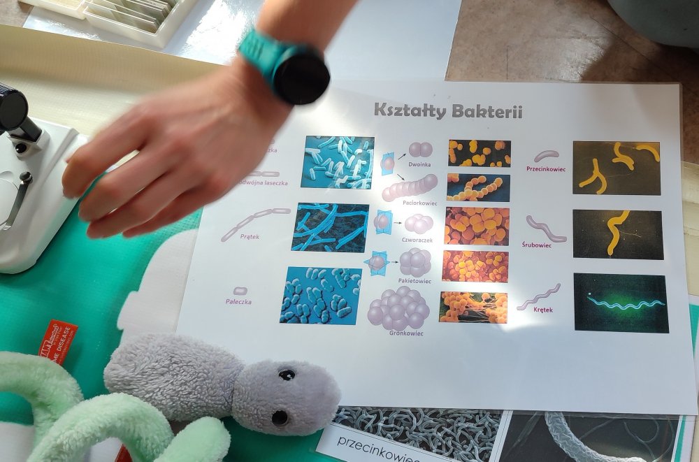 Dodatkową atrakcją były pluszowe modele bakterii i wirusów, które pomogły dzieciom wyobrazić sobie ich wygląd w przyjazny i przystępny sposób.