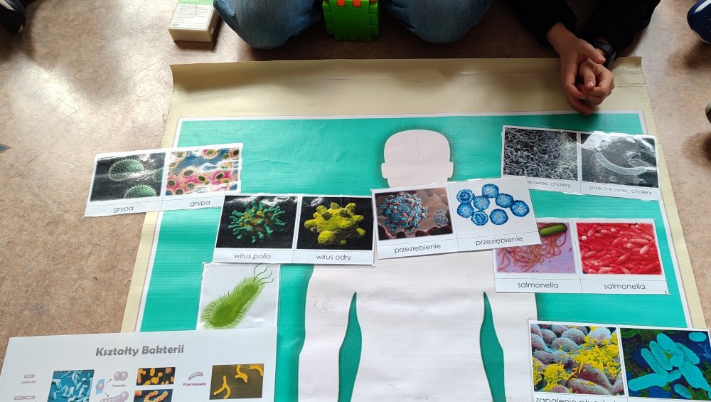 Tym razem tematem zajęć było pytanie: „Dlaczego chorujemy?”. Pani Justyna w bardzo interesujący sposób opowiadała o przyczynach chorób, wyjaśniając dzieciom, czym są bakterie i wirusy. Uczniowie mogli zobaczyć ilustracje przedstawiające kształty bakterii oraz zdjęcia wirusów, co pozwoliło im lepiej zrozumieć omawiane zagadnienia.