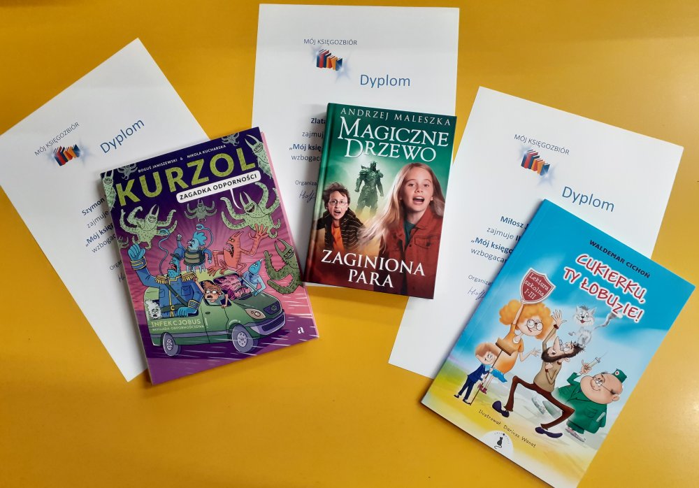 Szymon, Zlata i Miłosz otrzymują dyplomy, nagrody książkowe (książki, o które chcieli wzbogacić swój księgozbiór). Szymon dostaje „Kurzol. Zagadka odporności”, Zlata „Magiczne drzewo. Zaginiona para”, Miłosz – książkę „Cukierku, Ty łobuzie!” oraz niespodziankę*.