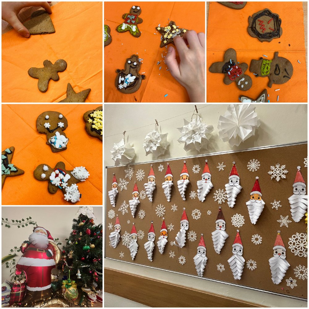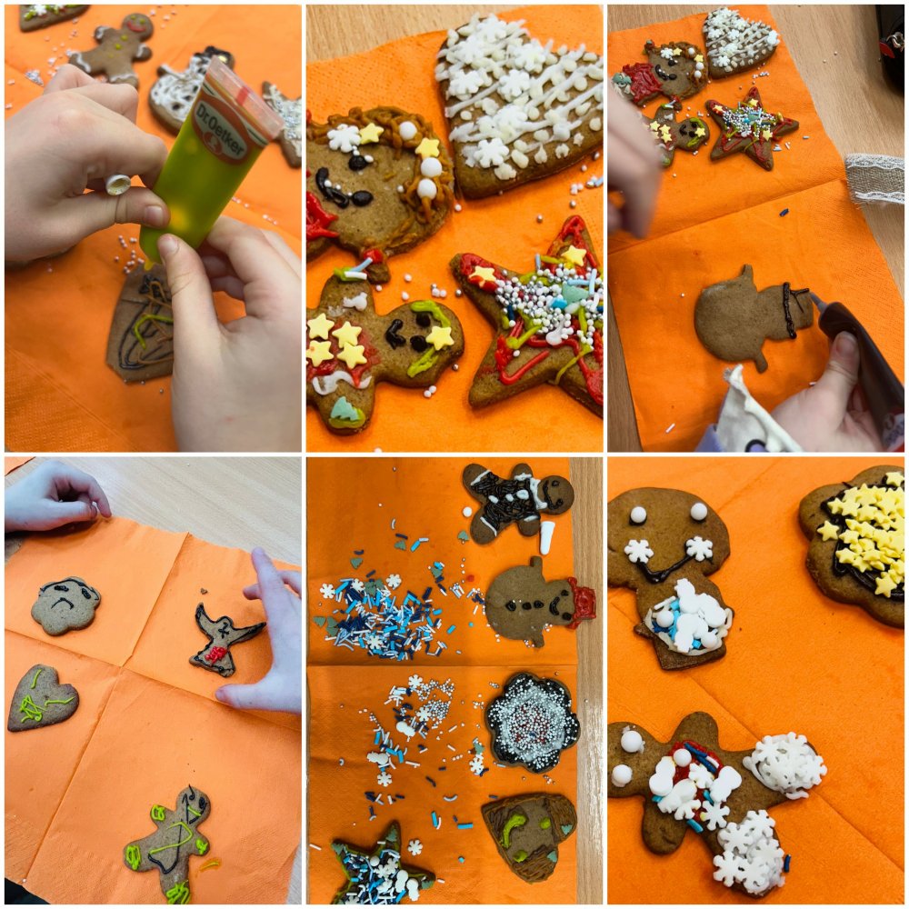 Część klasy wybrało natomiast dekorowanie pierników upieczonych przez p. Kamilę specjalnie na tę okazję. Uczniowie wyposażeni w lukry i kolorowe posypki tworzyli prawdziwe małe dzieła sztuki. Zapach świeżych pierników i świąteczna muzyka sprawiły, że wszyscy poczuliśmy wyjątkową atmosferę.